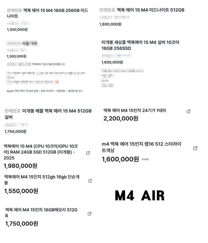 맥북 에어 M4 504_445007-6a> | [16GB/256GB]171만원 [16GB/512GB]201만원 [24GB/256GB]201만원 [24GB/512GB]230만원 [24GB/1TB]261만원 [32GB/512GB]261만원 [32GB/1TB]291만원 [32GB/2TB]351만원 504_922fe2-54> | [16GB/256GB] 160만원 미개봉 [16GB/512GB]175~180만원 미개봉 [24GB/256GB]175~180만원 미개봉(정보부족) [24GB/512GB] 198만 미개봉 [24GB/1TB]230~240만원 미개봉(정보부족) |